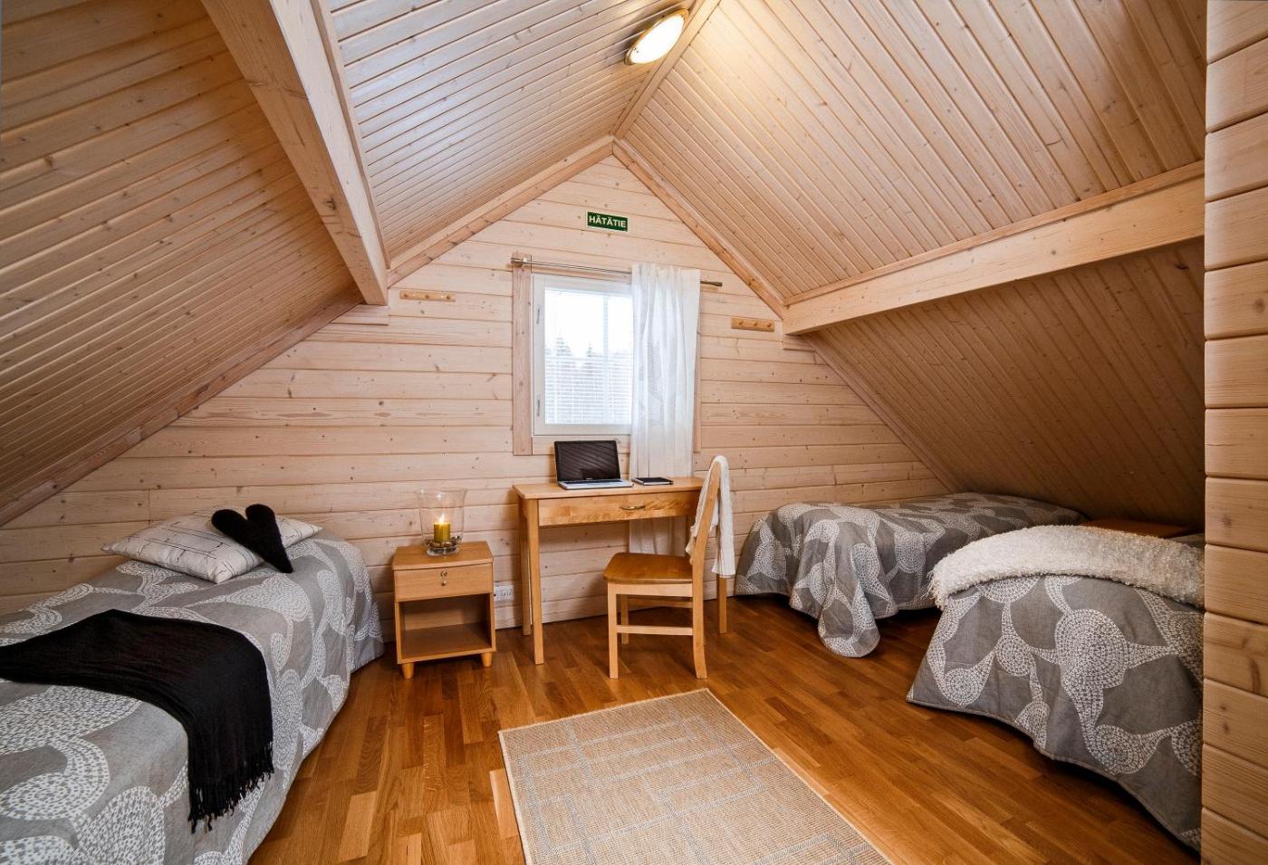 Contemporary furnishings and amenities are included inthe 2-bedroom cottages at Luoman Hirvimökit. Each has a seating area with a fireplace, flat-screen TV with cable channels and a DVD player.
