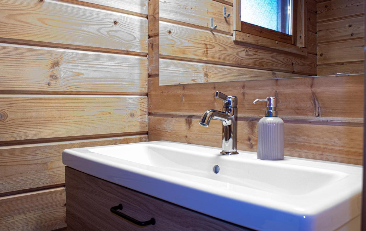 Cottage with Sauna (4 Adults). Log cottage with a sauna and patio that features a well-equipped kitchen, as well as a living room with a fireplace and flat-screen TV with DVD player.